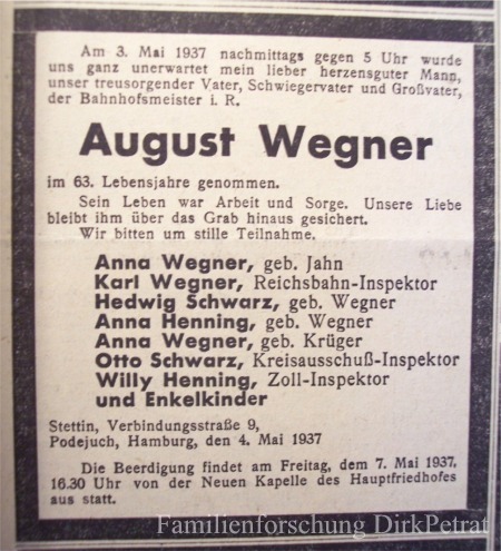 Pommersche Zeitung 05.05.1937 August Wegner - Anna Wegner, geb. Jahn - Karl Wegner - Hedwig Schwarz, geb. Wegner - Anna Henning, geb. Wegner - Anna Wegner, geb. Krüger - Otto Schwarz - Willy Henning