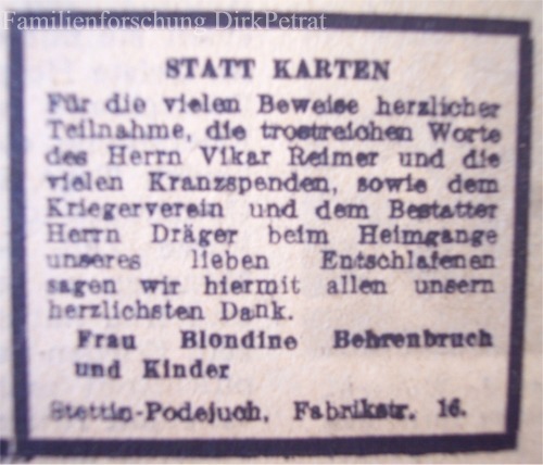 Pommersche Zeitung 17.11.1941 Blondine Behrenbruch - Fabrikstraße 16 Bestatter Herr Dräger Vikar Reimer