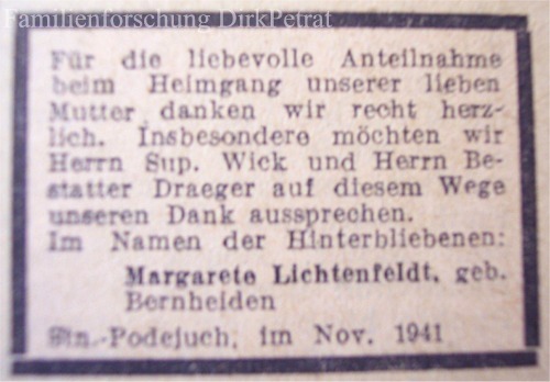 Pommersche Zeitung 19.11.1941 Margarete Lichtenfeldt, geb. Bernheiden Superintendent Wick Bestatter Herr Dräger